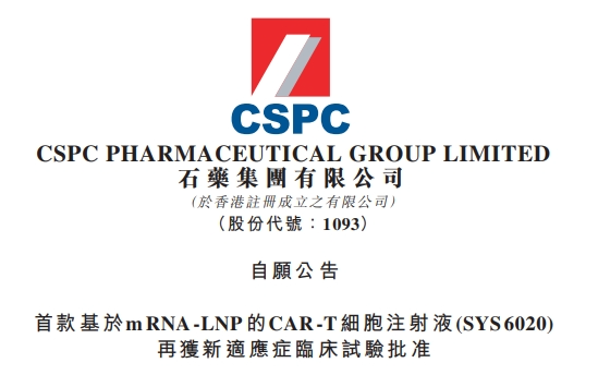 10月25日,石药集团宣布,本集团开发的首款基于mRNA-LNP的嵌合抗原受体(CAR)-T细胞注射液(SYS6020)(“该产品”)已获中华人民共和国国家药品监督管理局批准,可以在中国开展重症肌无力(MG)适应症的临床试验。此前,该产品已经获得多发性骨髓瘤(MM)以及系统性红斑狼疮(SLE)的临床试验批准。
