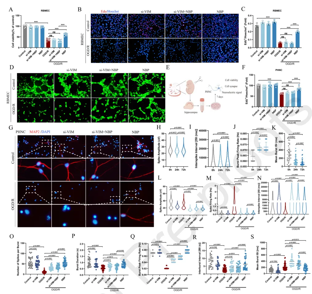 结果三:建立OGD/R诱导的细胞损伤模型,通过敲低技术探究VIM的功能,结果表明VIM敲低显著抑制了NBP的保护作用,NBP需要依赖VIM来促进血管新生。
