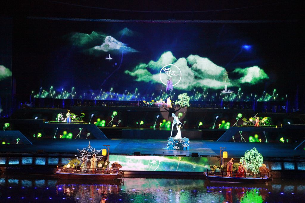 此次水上实景演出,共分青山绿水间、曲韵越千年、风华传万代、初心永不忘四个篇章。依托滹沱河明曦湖水景,通过中心舞台、水面场景、空中展示等不同场景交替组合,演绎着滹沱河流域悠长的历史文化脉络。同时,通过展示传统建筑、雕塑、书法等深厚文化传承,以及共和国从这里走来的壮阔征程,全面展现燕赵儿女对美好生活的向往与不懈奋斗。