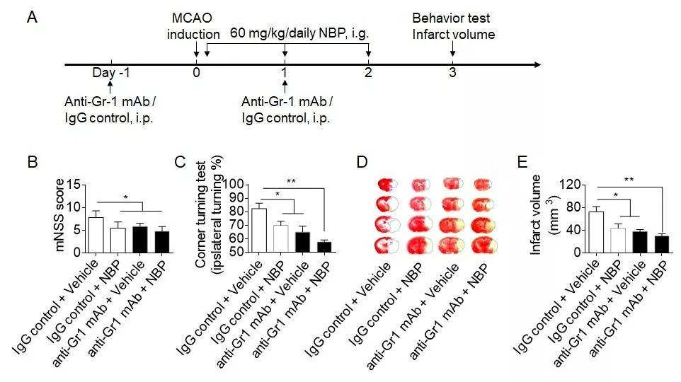 图4 Gr1+髓样细胞参与NBP对缺血性卒中的保护作用。