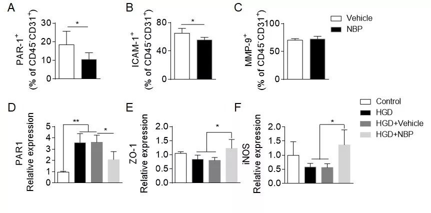 (A-C)NBP处理组和对照组中内皮细胞的PAR-1、ICAM-1、MMP-9在缺血再灌注小鼠模型中的表达变化。(D-F)体外实验研究NBP对内皮细胞系(bEnd3)在低氧葡萄糖剥夺体外模型中PAR-1、ZO-1、iNOS的表达调控。