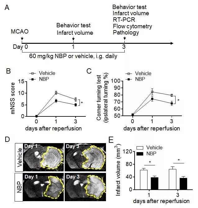 (A)评估NBP在60分钟缺血再灌注脑梗模型中对神经功能缺损及脑梗体积的影响的实验流程图示。灌注后立即给予NBP或对照溶剂,连续给予三天。第1天和第3天,进行mNSS评分和转角实验评估神经功能缺损。7T核磁和TTC染色评估梗死体积。(B)第1天和第3天两组mNSS评分和转角统计结果。(C)第1天和第3天两组梗死面积的核磁图像及统计结果。