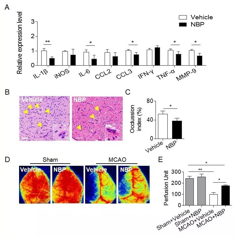 (A)比较NBP处理组和对照组炎性相关的细胞因子表达水平。(B-C)HE染色比较两组血管中微栓的阻塞指数。(D-E)激光散斑多普勒比较假手术组、模型组分别予NBP及对照溶剂后脑血流变化。