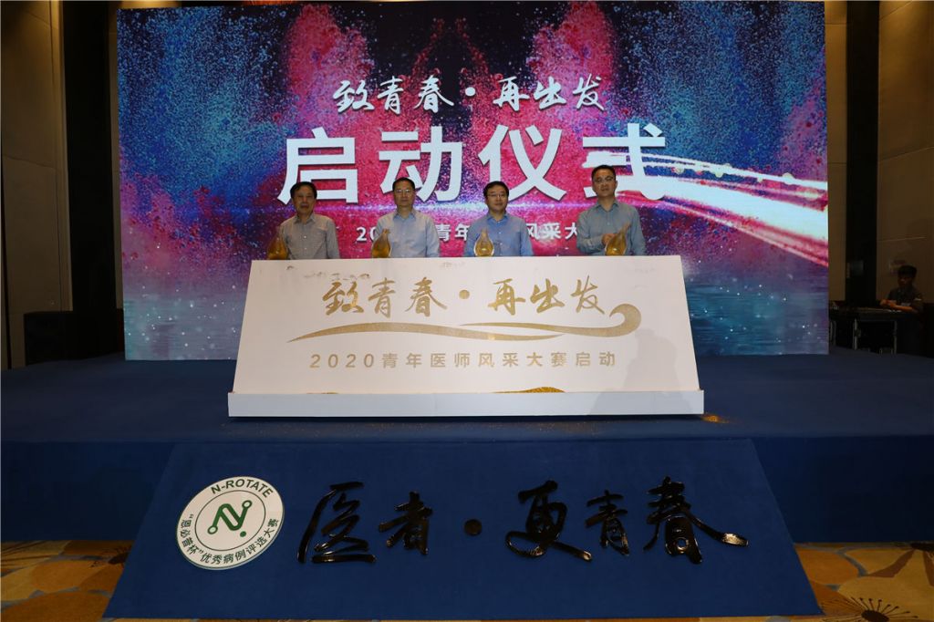 致辞完毕,曾进胜教授、蔡毅教授、邓幼清教授和苏计忠副总共同上台进行“致青春·再出发”2020年青年医师风采大赛启动仪式。