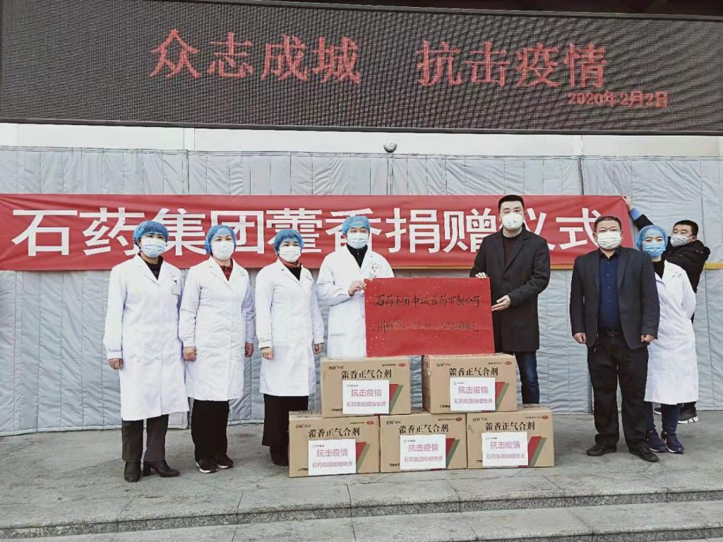 在诊疗方案第三版明确了藿香正气合剂对新冠肺炎预防有一定效果后,2月2日,石药集团江苏泰诺医药有限公司向石家庄市新型冠状病毒感染的肺炎医疗救治定点医院石家庄市第五医院捐赠藿香正气合剂500盒,用于疫情防控工作,全力阻击新冠病毒。