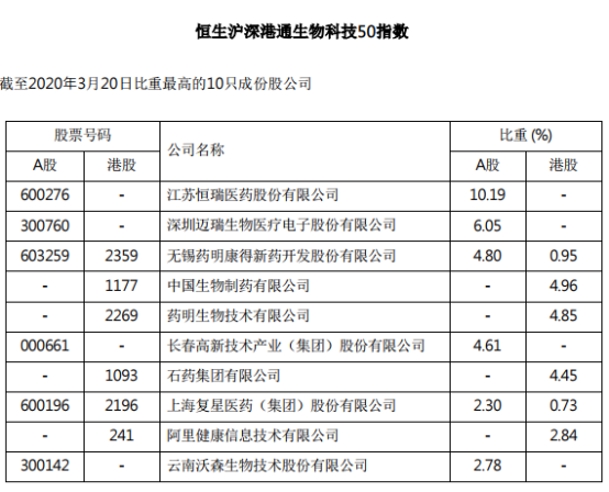 恒指推沪深港通生物科技50指数 石药集团获纳入比重最高前10成分股
