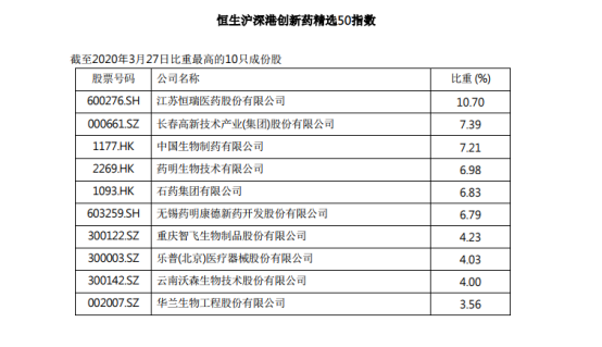 昨日,恒生指数有限公司(“恒生指数公司”)推出恒生沪深港创新药精选 50 指数,并公布截至2020年3月27日,入选恒生沪深港创新药精选 50 指数中比重最高的10只成份股。其中,石药集团(01093)被纳入。