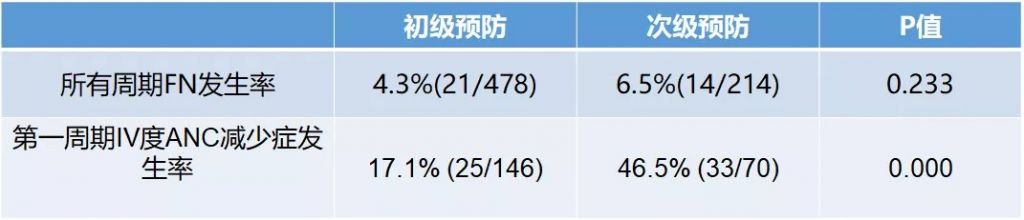 • 所有周期FN的发生率为5.0%,其中初级预防所有周期FN发生率低于次级预防但两组无统计学差异。