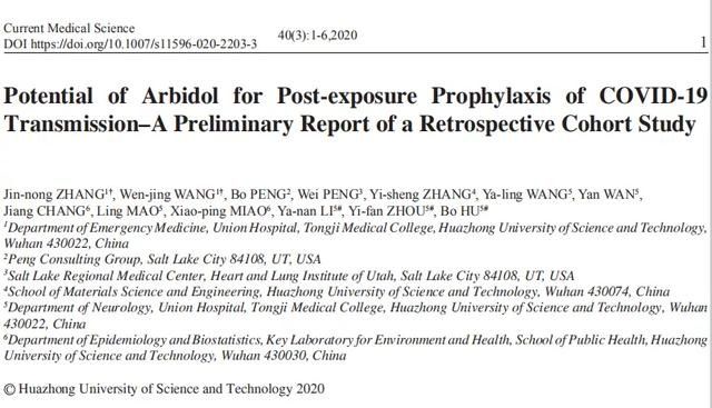 ZhangJinnong, et al. Potential of Arbidol for Post-exposure Prophylaxis of COVID-19 Transmission–APreliminary Report of a Retrospective Cohort Study. Chinese Medical Journal.2020.40(3):1-6。