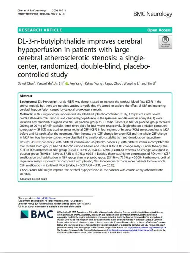 近日,来自空军特色医学中心神经内科石进教授研究团队的最新成果《DL-3-n-butylphthalide improves cerebralhypoperfusion in patients with large cerebral atherosclerotic stenosis: a singlecenter, randomized, double-blind, placebocontrolled study》在《BMC Neurology 》杂志发表(IF:2.233),该成果表明,丁苯酞软胶囊能够改善脑动脉粥样硬化性狭窄所致慢性脑组织低灌注。