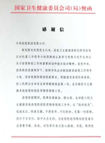 4月28日,国家卫生健康委新冠肺炎疫情应对处置工作领导小组保障组向石药控股集团有限公司发来感谢信,感谢石药集团在疫情防控医用物资保障工作中,“迅速反应、快速支援、不讲条件、不打折扣”给予的大力支持,并希望石药集团在之后“疫情防控人民战争、总体战、阻击战”中继续做出更大贡献。