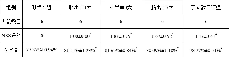 表1 各组大鼠神经功能缺损评分及脑含水量情况