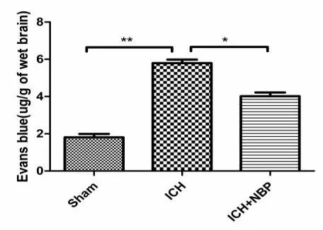 脑出血后脑组织血肿周围及脑表面伊文思蓝外渗明显增加,加入丁苯酞干预以后伊文思蓝外渗减少(图3)。