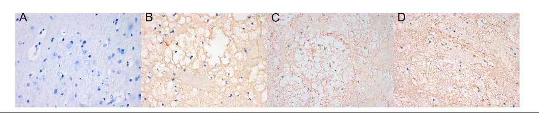 图4:脑出血后第1天、第3天和第7天脑组织中AQP4较假手术组均升高(箭头所指的黄色染色部分是AQP4的所在位置,蓝色部分是细胞核)。A.假手术组;B.脑出血1天组;C.脑出血3天组;D.脑出血7天组