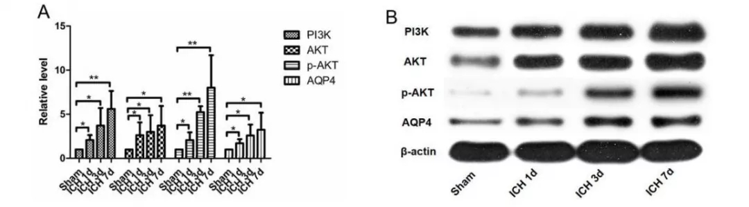 图片图5:脑出血后PI3K、AKT、p-AKT和AQP4的表达增加。在脑出血后1天开始增加,在脑出血后7天内继续增加(A,B)。*p<0.05,**p<0.01。