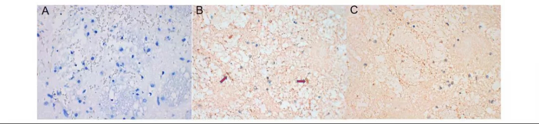 图片图6:在丁苯酞干预后AQP4较脑出血对照组降低(箭头指示的黄色染色部分是AQP4的所在位置,蓝色部分是细胞核)。A.假手术组;B.脑出血3天对照组;C.丁苯酞干预组