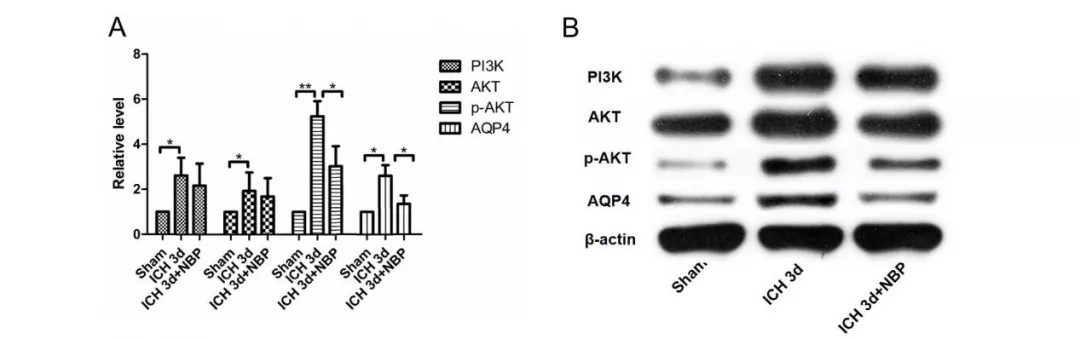 图片图7:在NBP干预后,PI3K、AKT表达无明显变化(A,B)。然而,在NBP干预后,p-AKT表达降低(A,B)。在NBP干预后AQP4的表达降低(A,B)。*p<0.05,**p<0.01