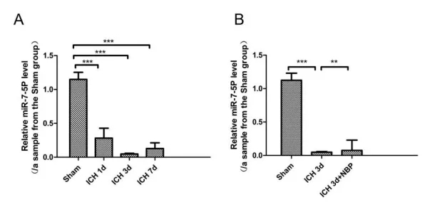 图9:脑出血后miR-7-5p(A)下降,脑出血后第3天miR-7-5p最低,丁苯酞干预后miR-7-5p(B)较脑出血对照组升高。*P<0.05,**P<0.01,***P<0.001