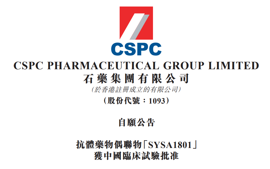 6月16日,石药集团(1093.HK)公告,集团开发的抗体药物偶联物(Antibody-Drug Conjugate)SYSA1801已获得中华人民共和国国家药品监督管理局批准,可开展于中国的临床研究。该产品在国内外已提交多件专利申请。