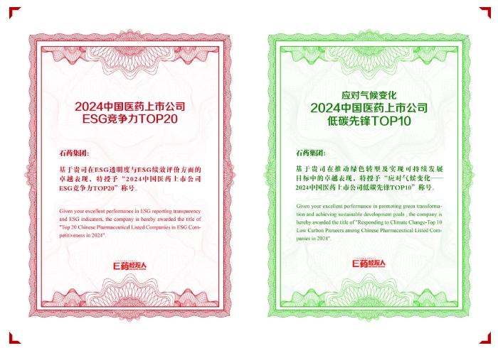 11月14日,由中国医药企业管理协会、中国医药生物技术协会、四川省医药行业协会主办,E药经理人承办的2024第16届中国医药企业家科学家投资家大会(CHSESI,简称“启思会”)在成都举行。2024年度中国医药上市公司ESG竞争力系列榜单在会上正式揭晓,石药集团凭借在ESG透明度与ESG绩效评价方面的卓越表现,被授予“2024中国医药上市公司ESG竞争力TOP20”荣誉称号;并基于公司在推动绿色转型及实现可持续发展目标中的卓越表现,被授予“应对气候变化2024中国医药上市公司低碳先锋TOP10”。这两项荣誉肯定了集团在环境、社会和治理(ESG)方面付出的努力和显著成效,企业价值得到进一步的印证。