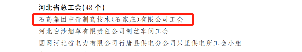 根据中华全国总工会办公厅发布《中华全国总工会关于表彰全国模范职工之家 全国模范职工小家 全国优秀工会工作者的决定》,石药集团中奇制药技术(石家庄)有限公司工会委员会(下称:中奇公司工会)由河北省总工会推荐,荣获“全国模范职工小家”称号。这一殊荣不仅是对中奇公司工会工作的高度认可,更是对公司强大凝聚力和战斗力的充分肯定。