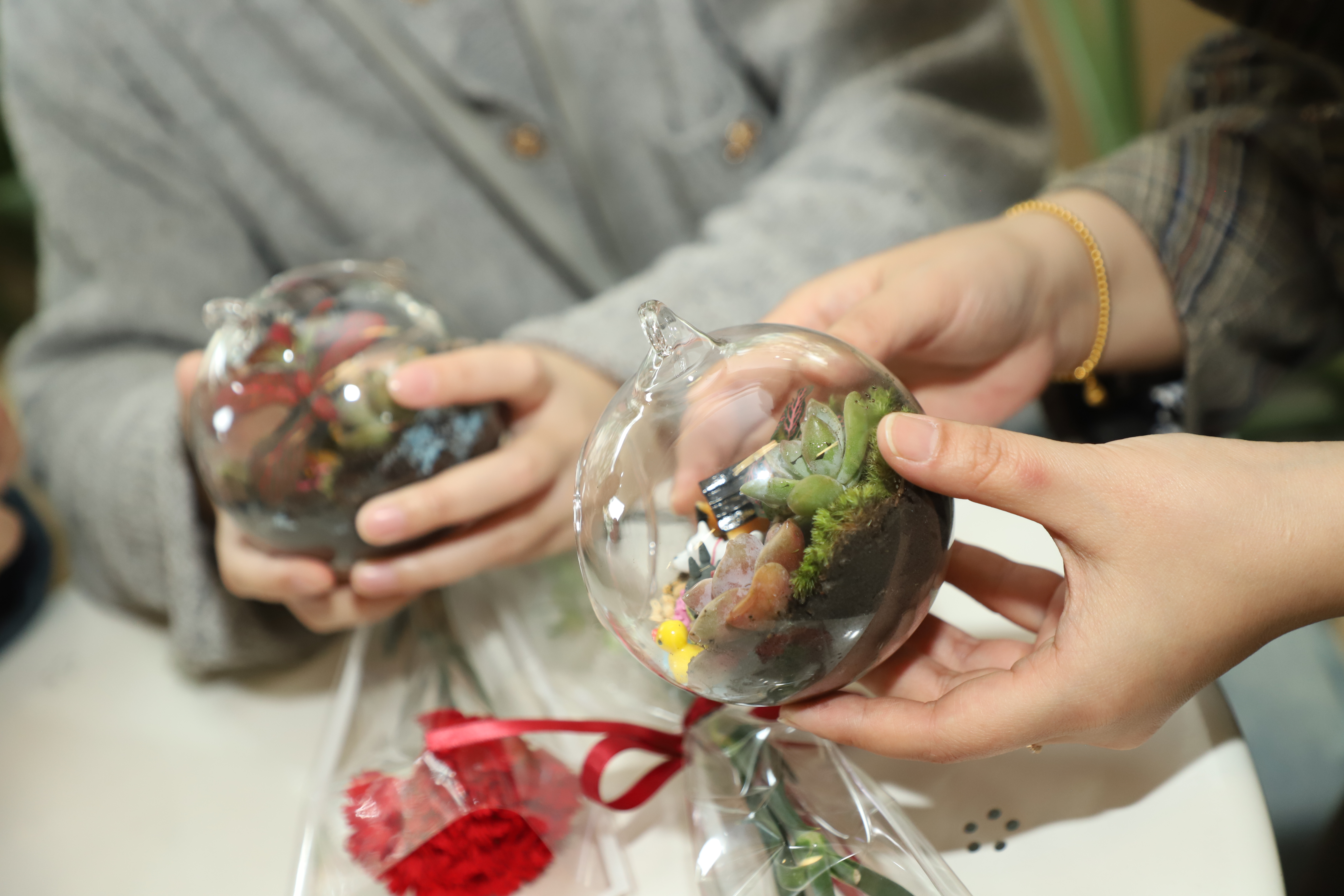 活动现场,材料丰富多样,玻璃容器、彩色石子、多肉苔藓等一应俱全,满是自然气息。专业园艺老师详细讲解制作方法与养护要点,从植物搭配到景观布局,再到日常照料,让大家迅速掌握技巧。大家充分发挥创意,用石子铺出小路,用苔藓营造草坪,将多肉巧妙安置。遇到问题,老师和志愿者及时给予帮助。