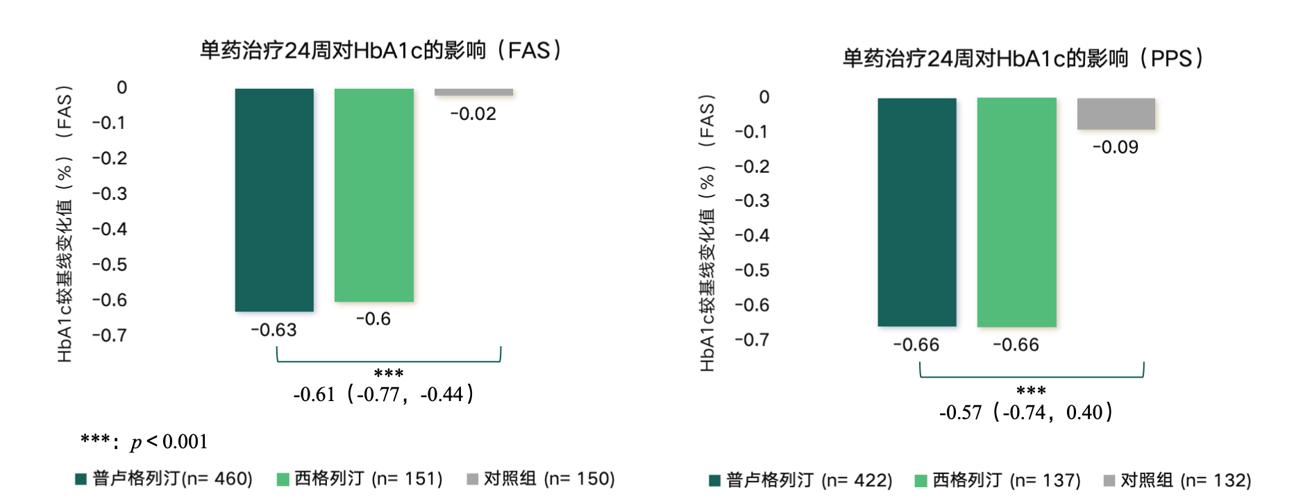 从降糖效果来看,由北京大学第一医院郭晓蕙教授牵头的普卢格列汀单药治疗未经治疗的T2DM患者的III期研究显示,普卢格列汀100mg QD治疗24周后,糖化血红蛋白(HbA1c)水平显著降低,降幅达0.61%(去除安慰剂效应,p<0.001),48%的患者血糖达标(HbA1c≤7%),患者空腹血糖(FPG)和餐后2h血糖(2h-PPG)也实现有效改善2。
