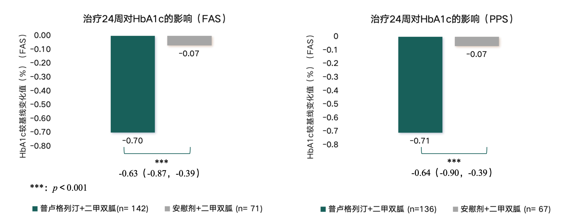 另一项普卢格列汀联合二甲双胍治疗T2DM患者的III期研究由北京协和医院肖新华教授牵头,在中国30个中心进行。结果显示,普卢格列汀100mg QD+二甲双胍治疗24周后,HbA1c水平降幅达0.63%(去除安慰剂效应,p<0.001), 50.0%的患者血糖达标(HbA1c≤7%), FPG和2h-PPG也均明显降低3。