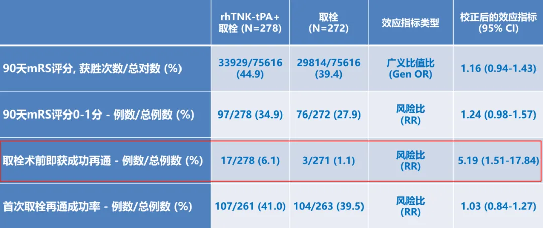 再灌注率:rhTNK-tPA联合取栓组取栓术前初始血管造影成功再灌注率显著更高(6.1% vs 1.1%,风险比5.19)。