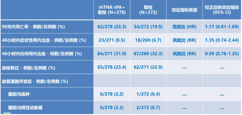 安全性:两组在90天死亡率(22.3% vs 19.9%)、症状性颅内出血(8.5% vs 6.7%)等指标上无显著差异,安全性相当。