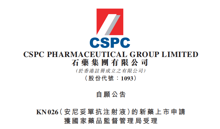 石药集团KN026(安尼妥单抗注射液)的新药上市申请获受理