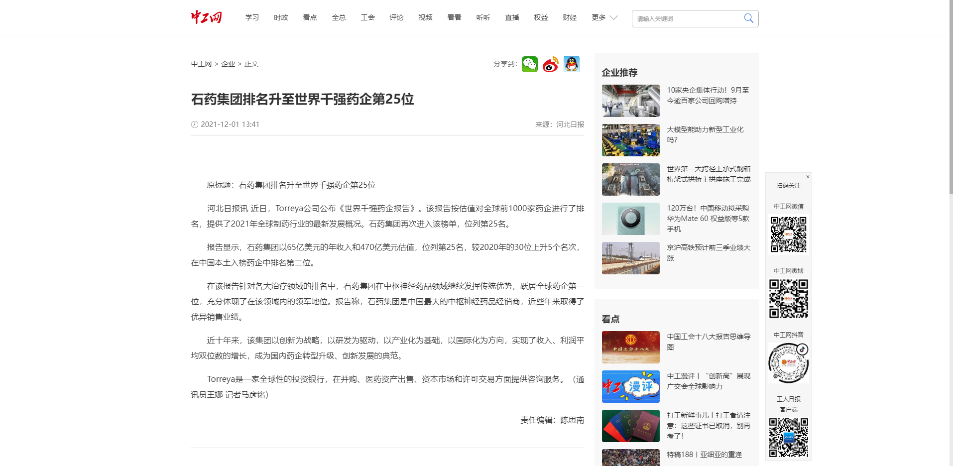 近日,Torreya公司公布《世界千强药企报告》。该报告按估值对全球前1000家药企进行了排名,提供了2021年全球制药行业的最新发展概况。石药集团再次进入该榜单,位列第25名。