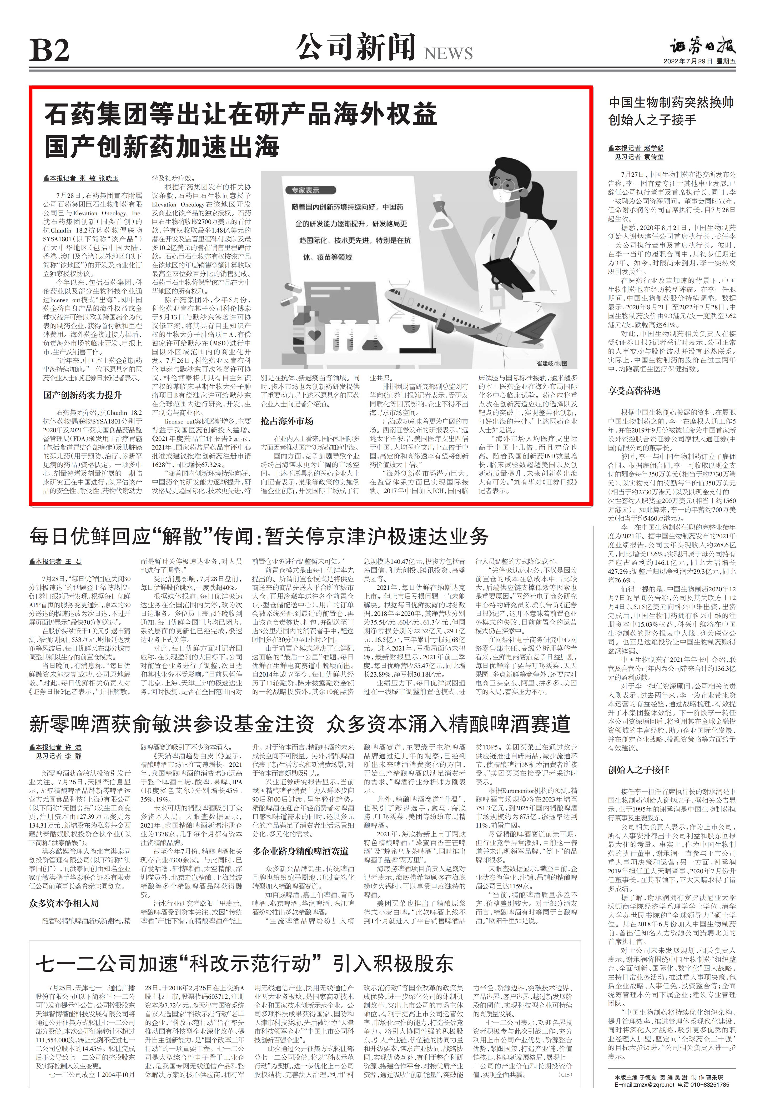 7月28日,石药集团宣布附属公司石药集团巨石生物制药有限公司已与Elevation Oncology, Inc.就石药集团创新(同类首创)的抗Claudin 18.2抗体药物偶联物SYSA1801(以下简称“该产品”)在大中华地区(包括中国大陆、香港、澳门及台湾)以外地区(以下简称“该地区”)的开发及商业化订立独家授权协议。