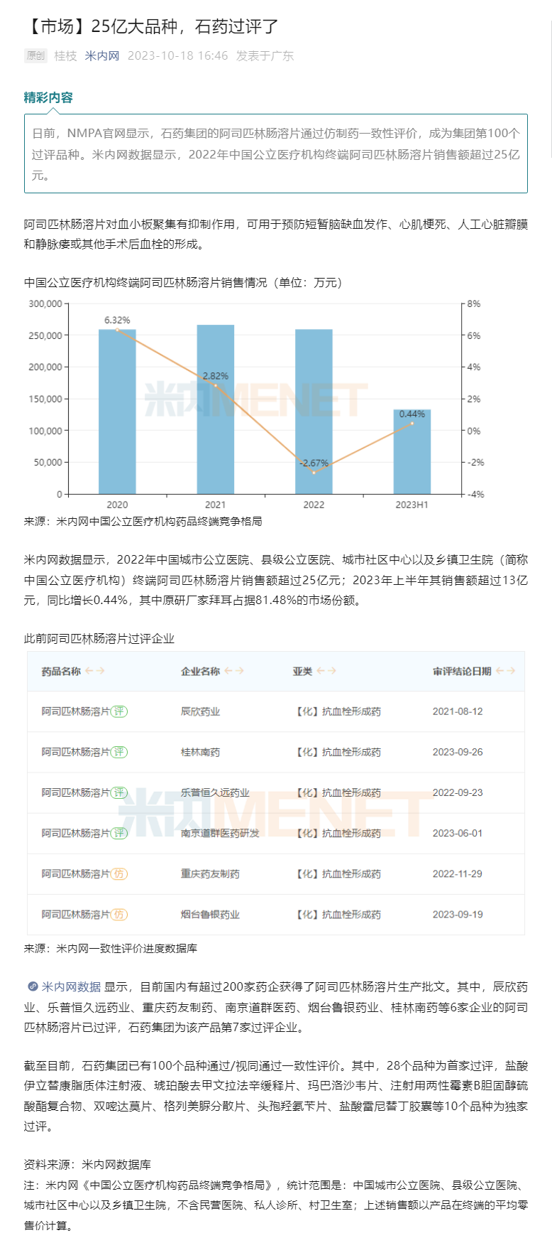 米内网数据显示,2022年中国城市公立医院、县级公立医院、城市社区中心以及乡镇卫生院(简称中国公立医疗机构)终端阿司匹林肠溶片销售额超过25亿元;2023年上半年其销售额超过13亿元,同比增长0.44%,其中原研厂家拜耳占据81.48%的市场份额。
