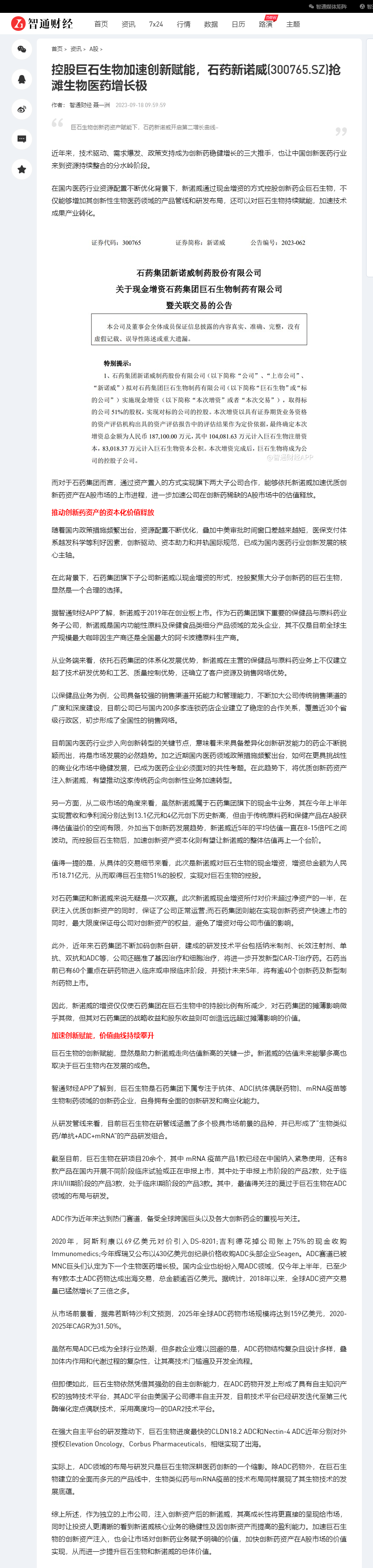 控股巨石生物加速创新赋能,石药新诺威(300765.SZ)抢滩生物医药增长极